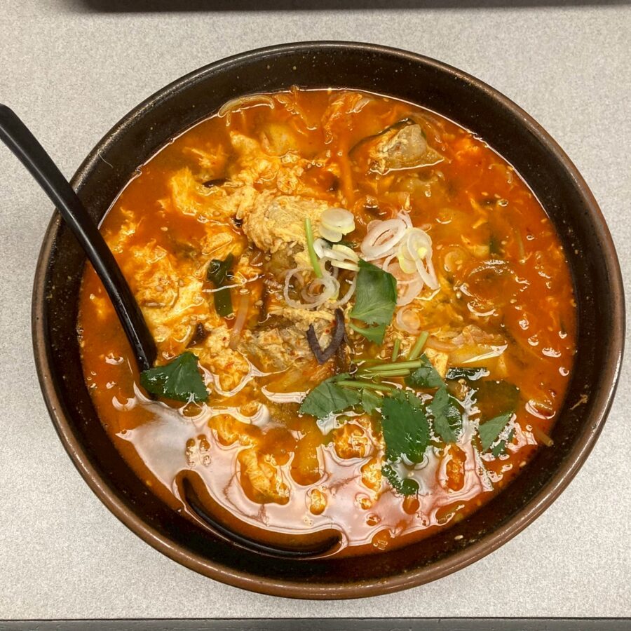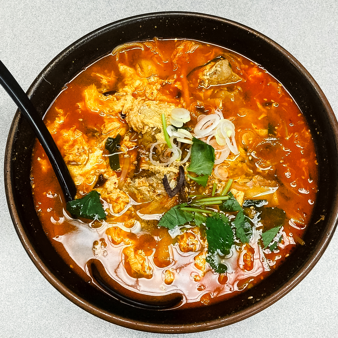 カルビラーメンの程よい辛さ、柔らかく大きな肉塊とたっぷりの具材でとにかく酒が進む。悪魔的だ。