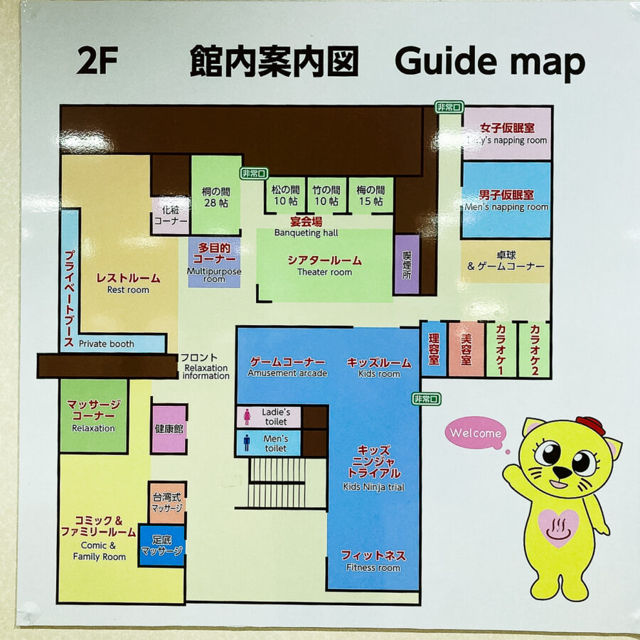 ゲームコーナー、コミック、休憩処、マッサージ、卓球、キッズスペース、宴会場、カラオケ、理容院、なんでもござれだ。