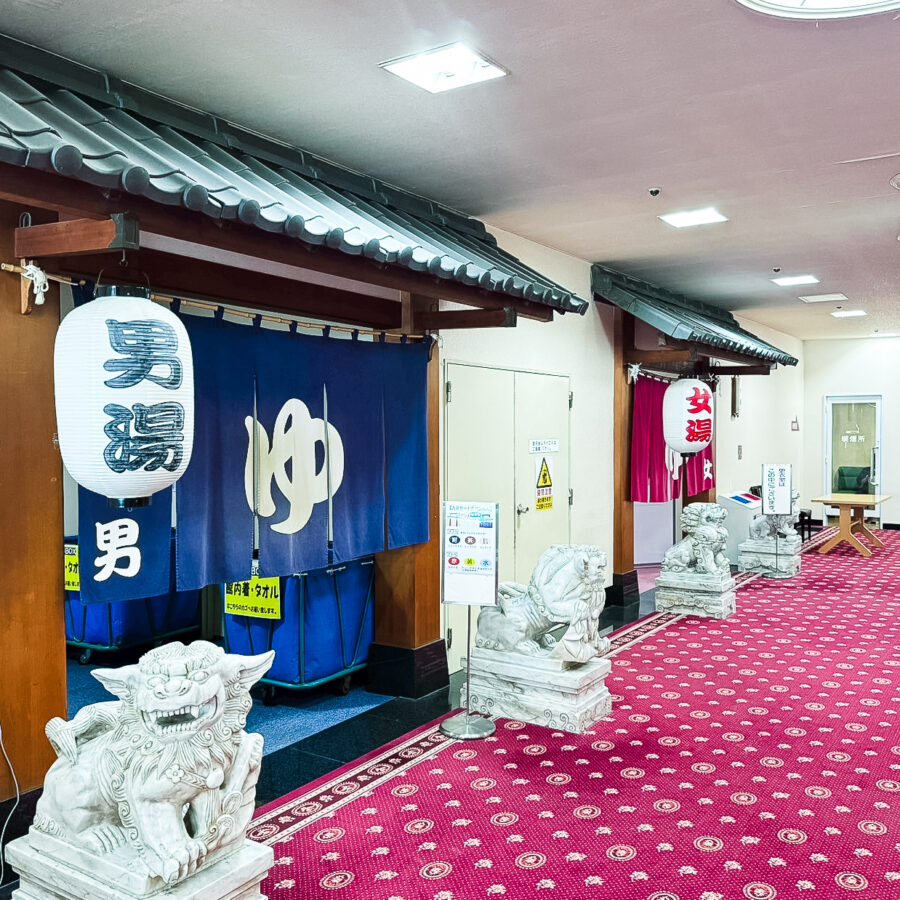 受付前の待合スペースには大きなシャンデリアがあり、脱衣所の入り口には瓦屋根と狛犬といった面白い構図となっている。もちろん筆者は好きだ。